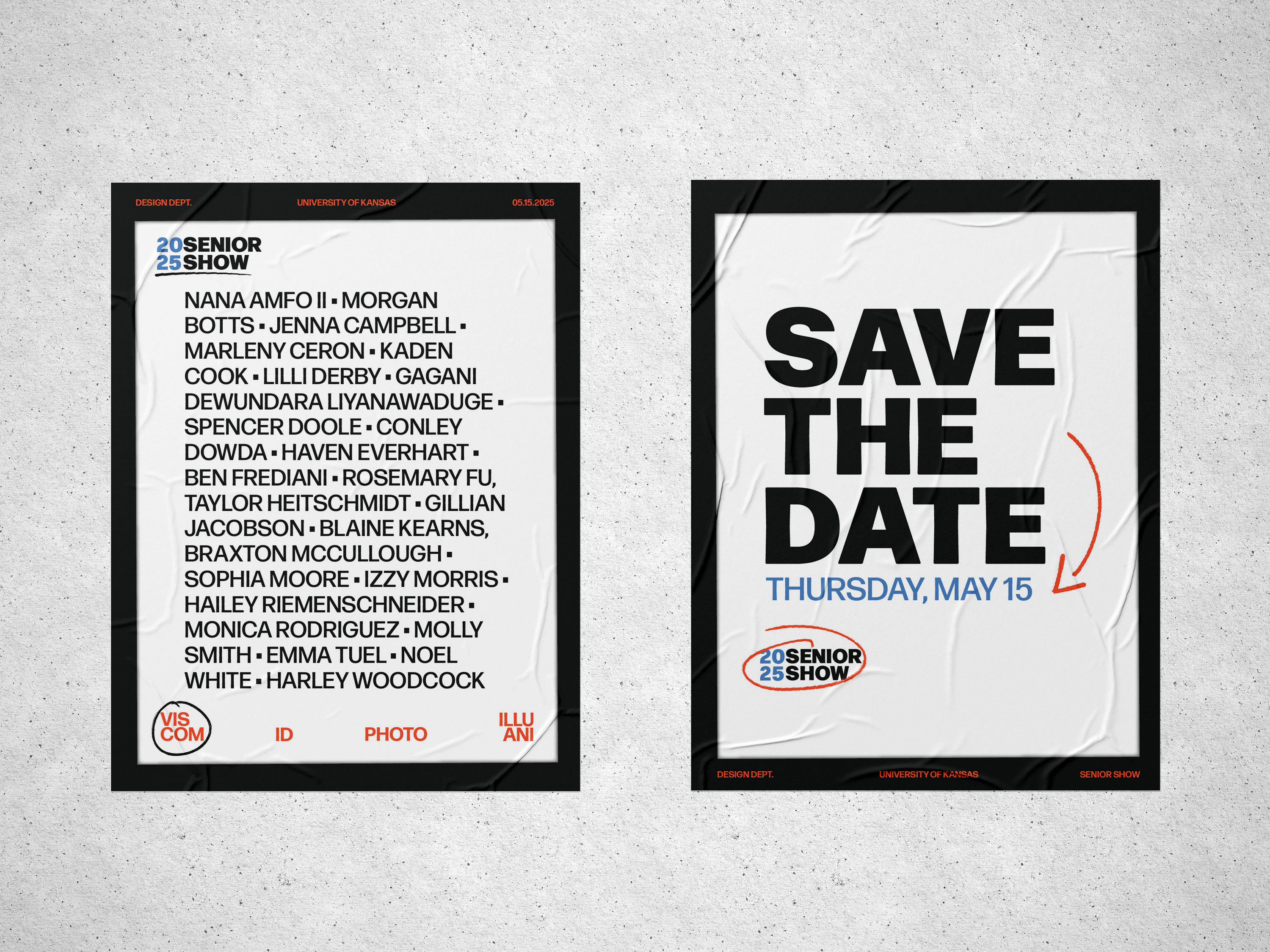 For the KU Design Senior Show branding, I drew inspiration from several student presentations, blending the strongest ideas into a cohesive visual system. We landed on a minimalist black-and-white palette with subtle pops of off-red and pale blue to add contrast and energy. The layout features small type along a black border to mimic a film strip, evoking the feeling of a reel or sequence. Bold, simple typography takes center stage, while hand-drawn elements add a personal, tactile touch to balance the structured layout.